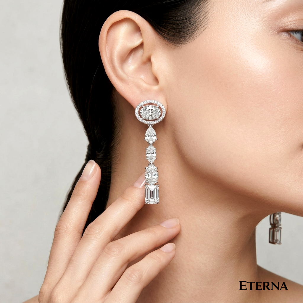 An exquisite symphony of brilliance, these drop earrings feature a cascading arrangement of mixed-cut diamonds pear, emerald, round, and cushion […]