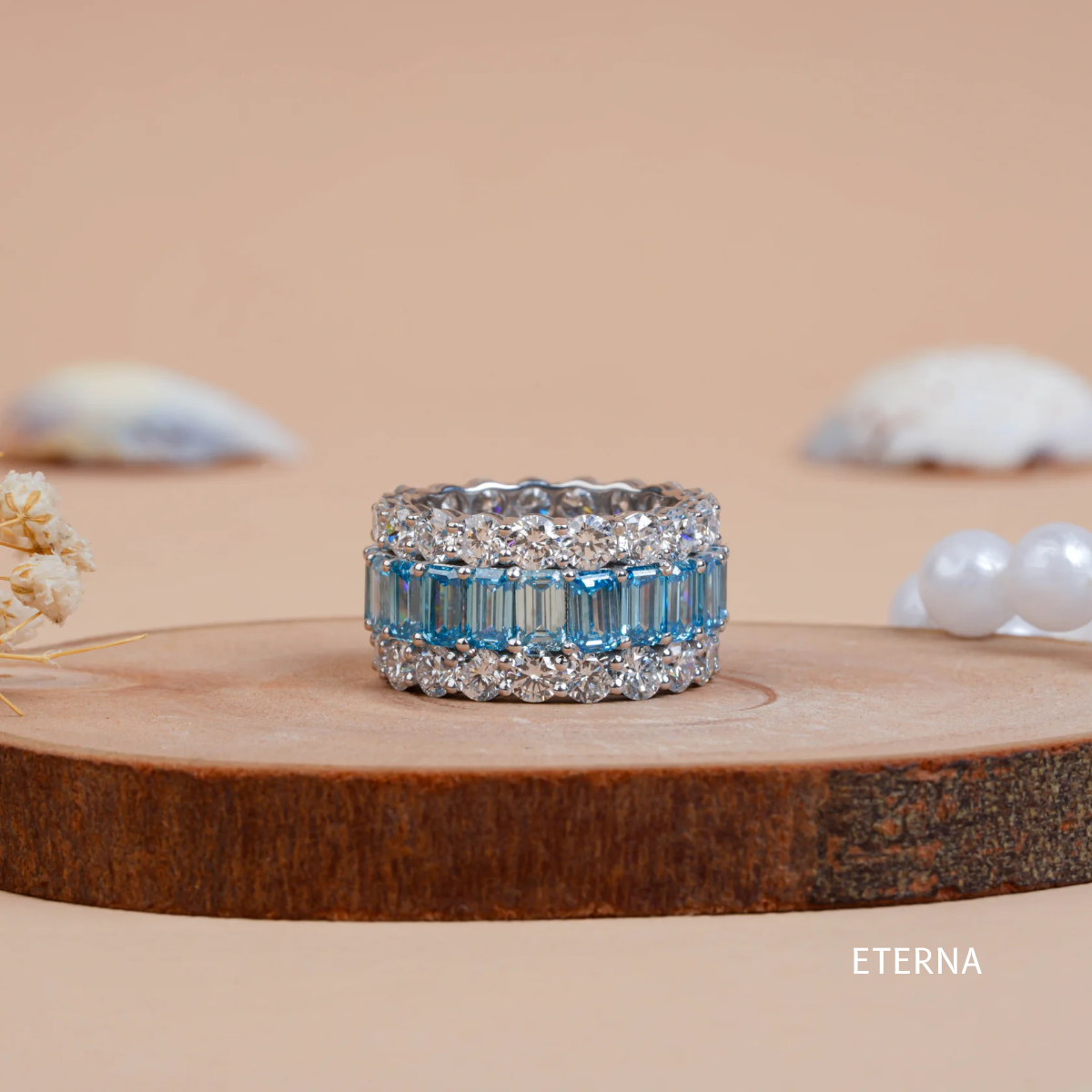 A bold expression of elegance and brilliance, the Aquarelle Eternity Ring features a continuous row of emerald-cut aquamarine stones, framed by shimmering round diamonds on both sides. Designed for maximum sparkle and refined structure, this eternity band captures light from every angle, making it a timeless statement of luxury and celebration.