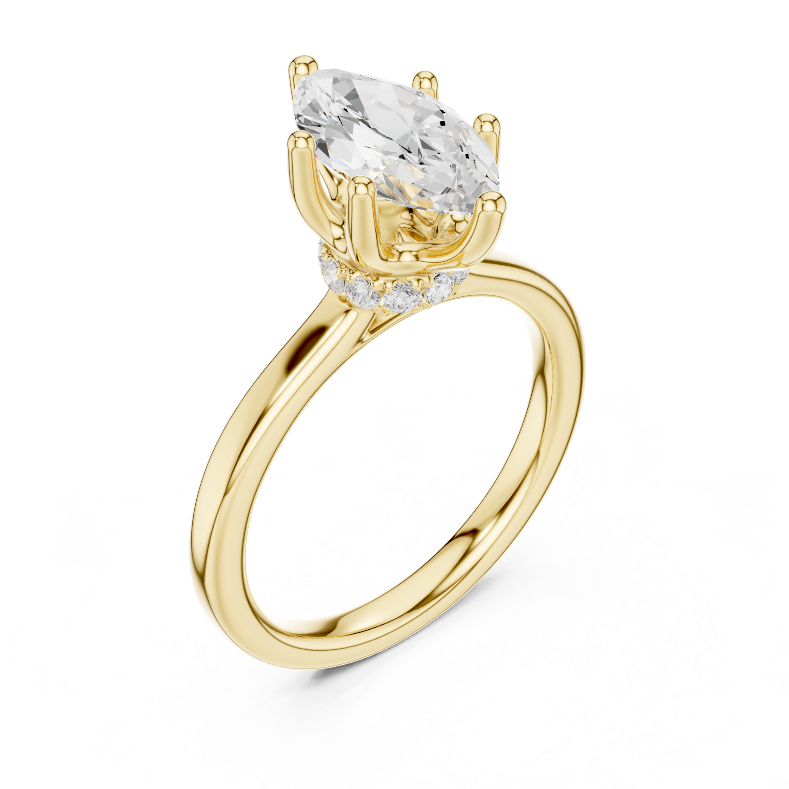 A refined blend of structure and brilliance, the Cirelle Marquise Ring features an elegant marquise-cut center stone secured in a sculpted prong setting. Elevated by a crown-inspired gallery with subtle hidden detailing, this ring captures light from every angle, embodying timeless sophistication and modern luxury.