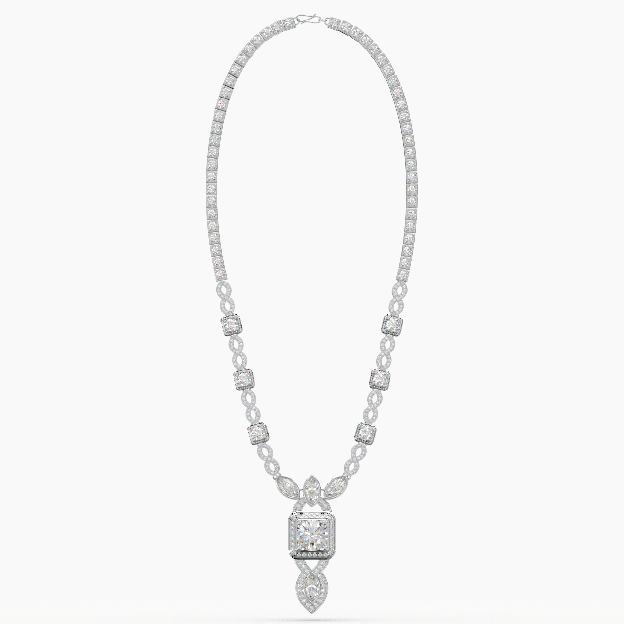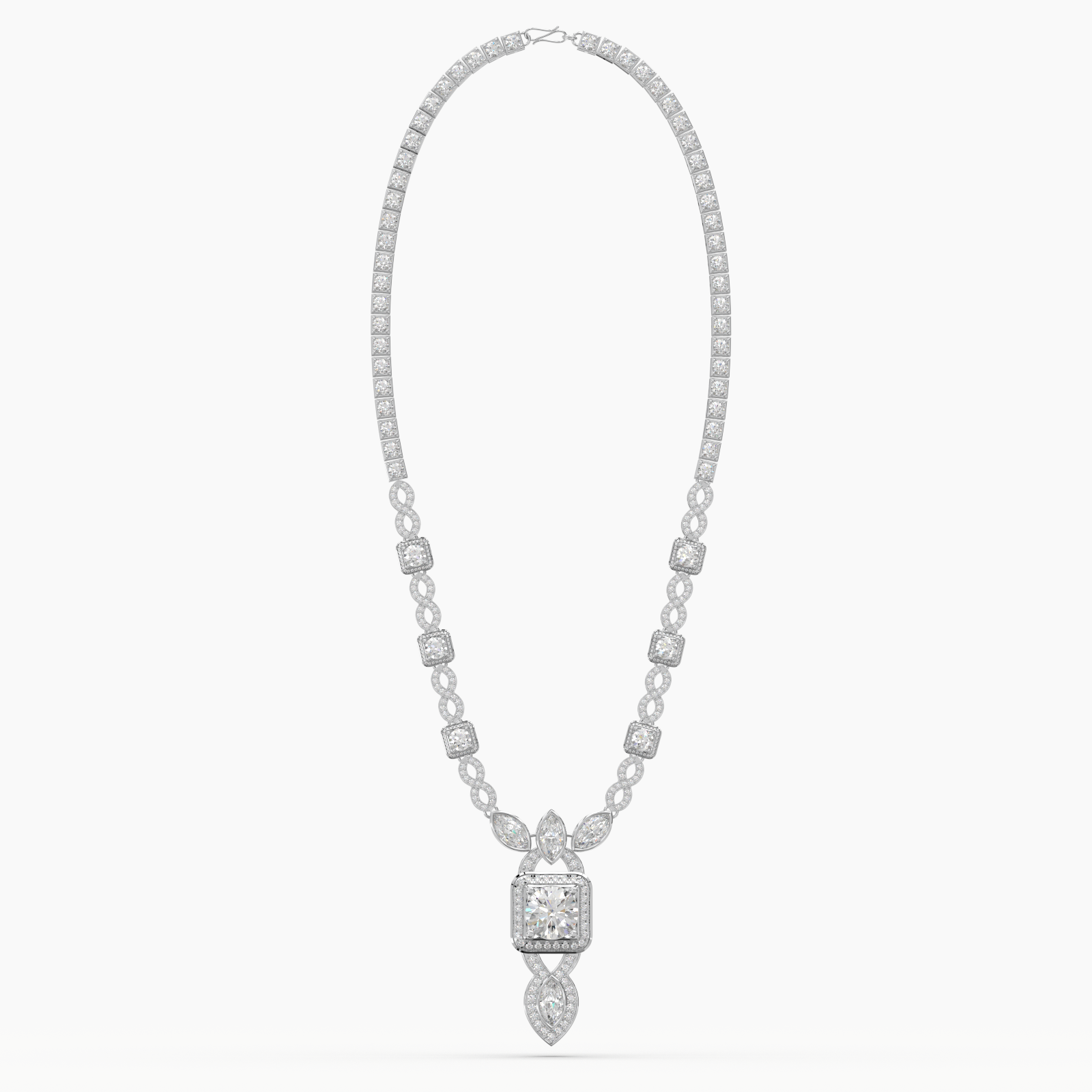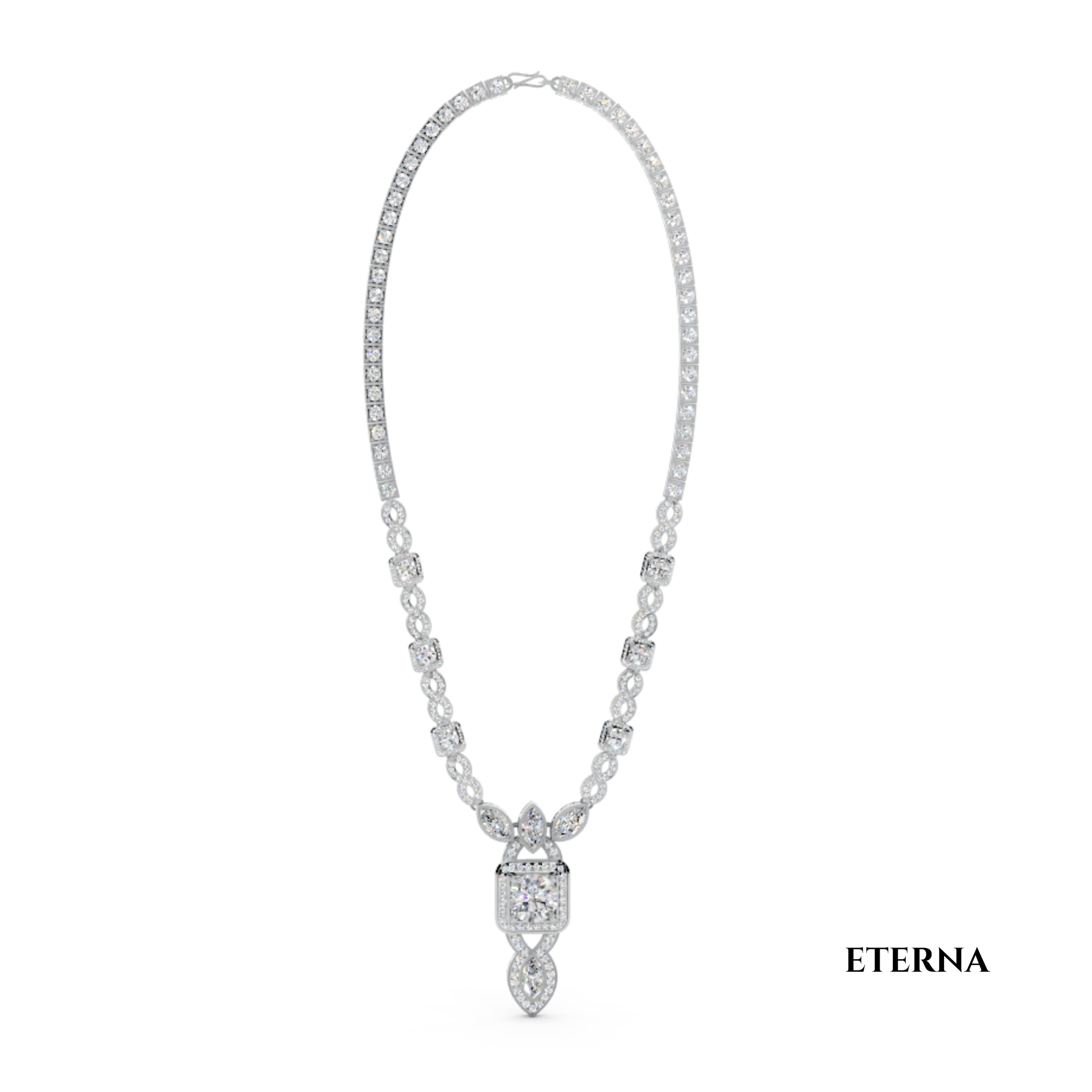 A graceful expression of infinity, this necklace features a seamless flow of brilliant diamonds leading to an elegant centerpiece. The delicate chain and refined motifs create a timeless silhouette, symbolizing endless beauty and eternal connection.