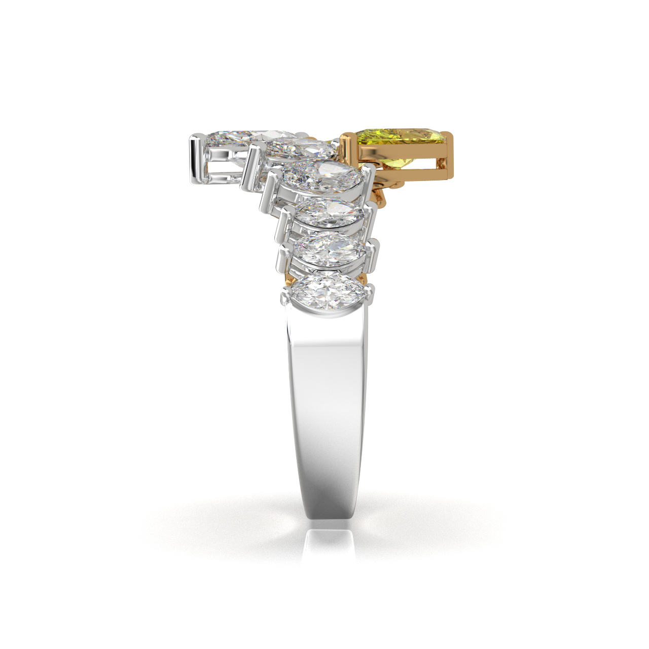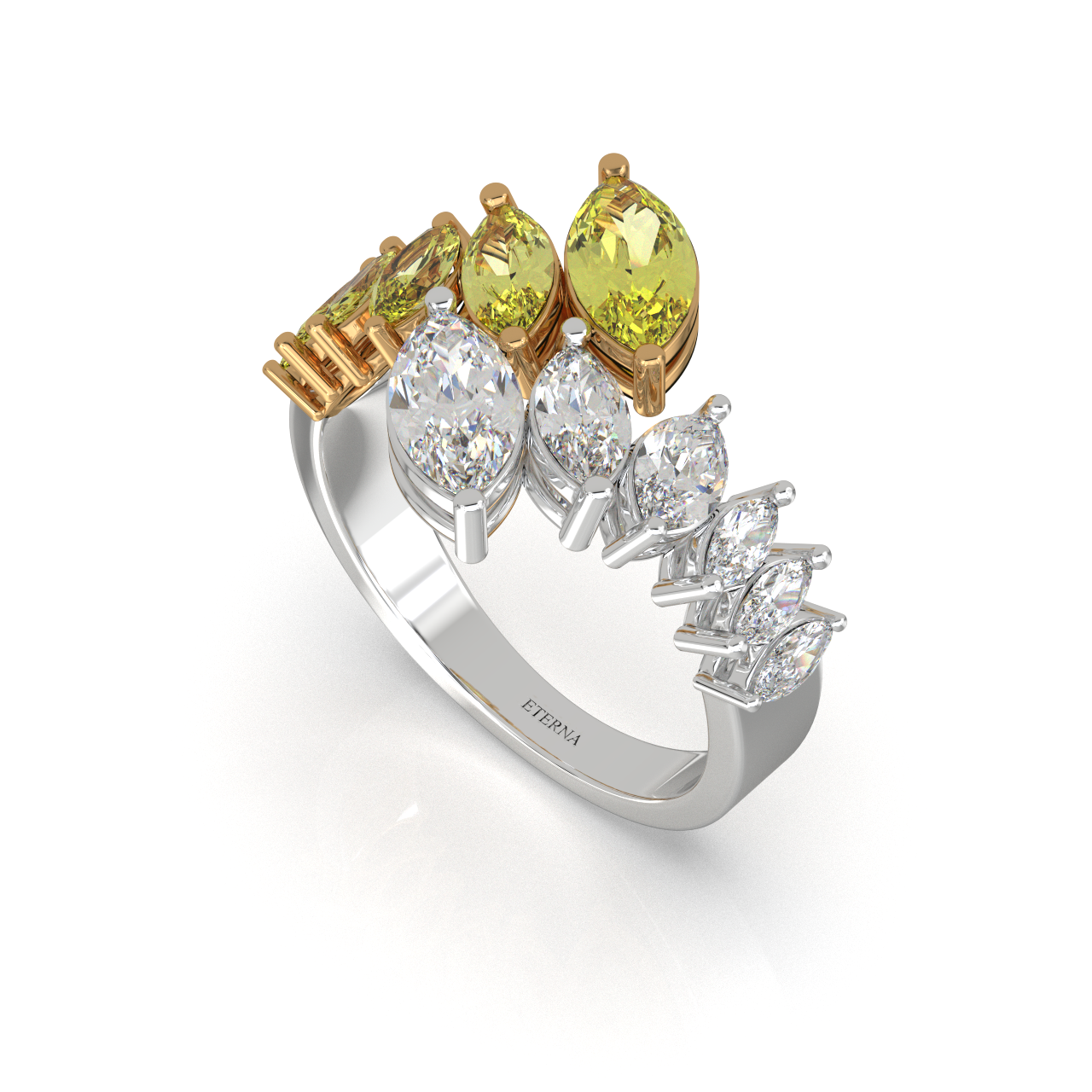 A bold expression of modern royalty, this band features a seamless cascade of marquise-cut yellow and white stones, flowing in perfect harmony. The layered design creates a striking wave of brilliance, blending golden warmth with radiant sparkle for a sophisticated, statement-making look.