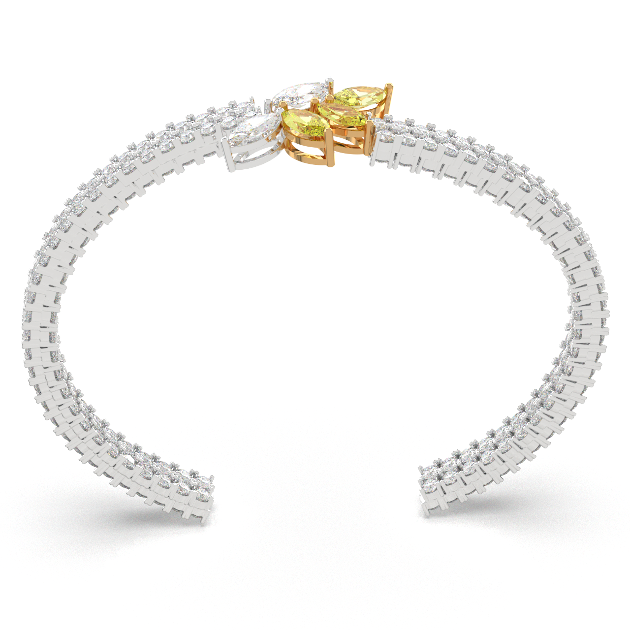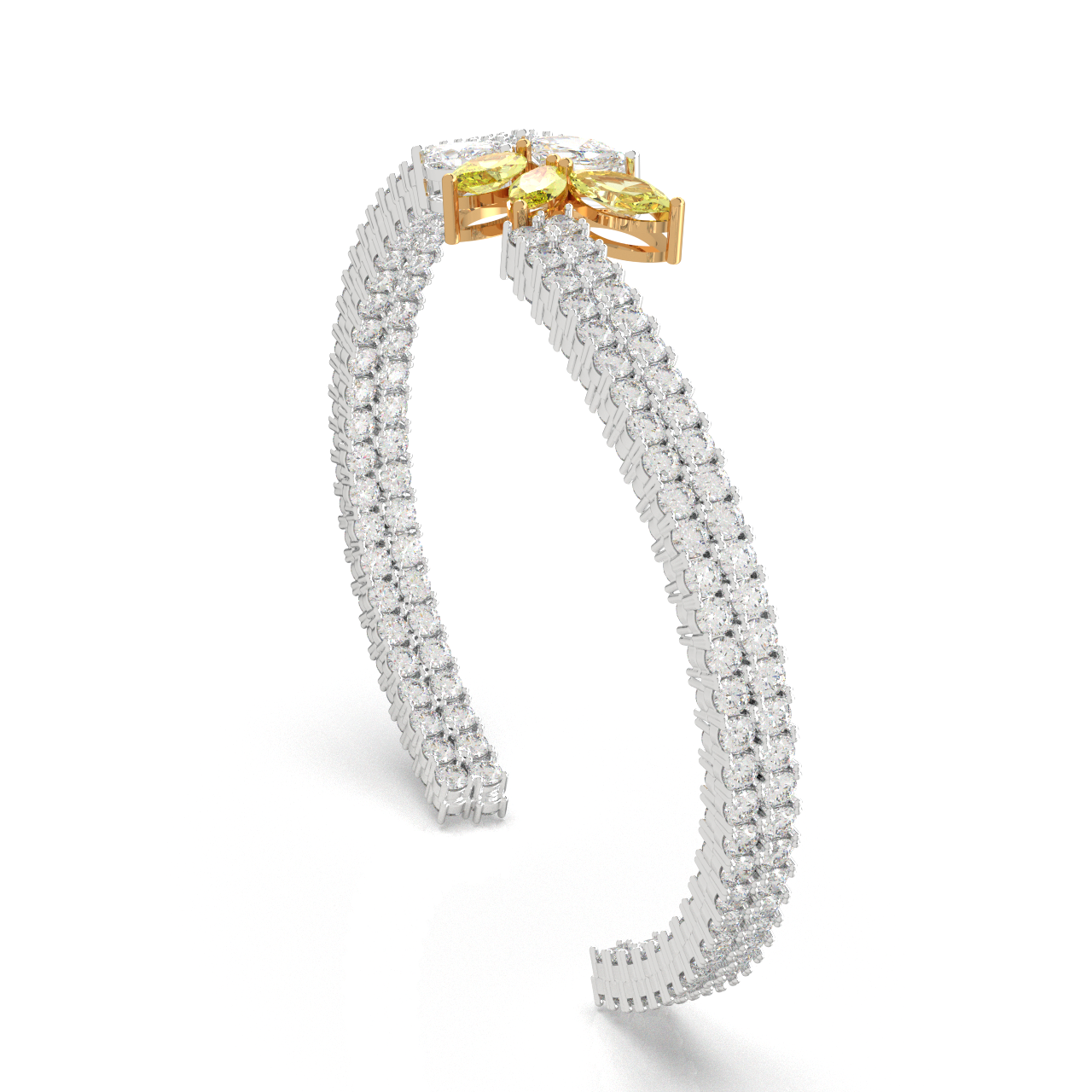 A refined expression of regal elegance, this bracelet features twin rows of brilliant diamonds flowing into a radiant floral centerpiece of yellow and white marquise stones. Designed to shimmer with every movement, it captures the essence of graceful luxury and timeless sophistication.