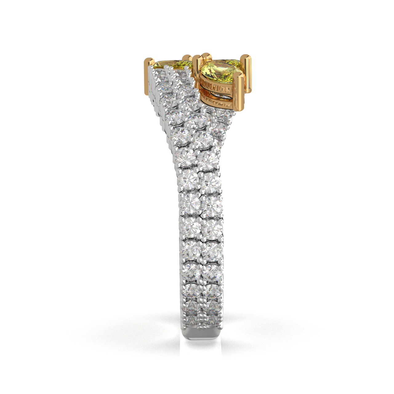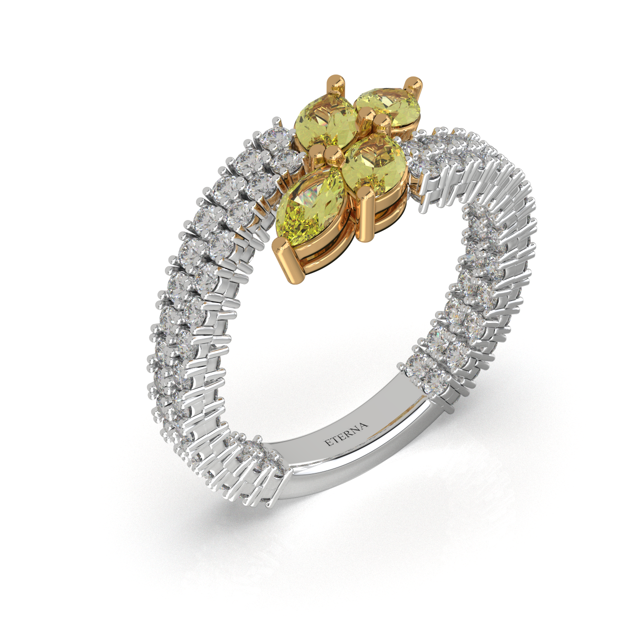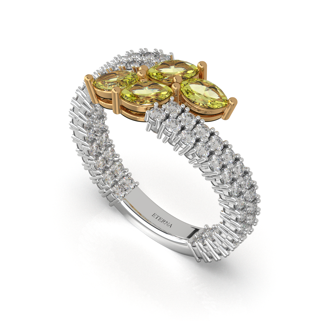 A radiant fusion of brilliance and warmth, this ring showcases a dual diamond band crowned with marquise-cut yellow stones in a delicate floral arrangement. The contrast of icy white sparkle and golden hues creates a refined, luminous statement perfectly embodying elegance with a contemporary royal touch