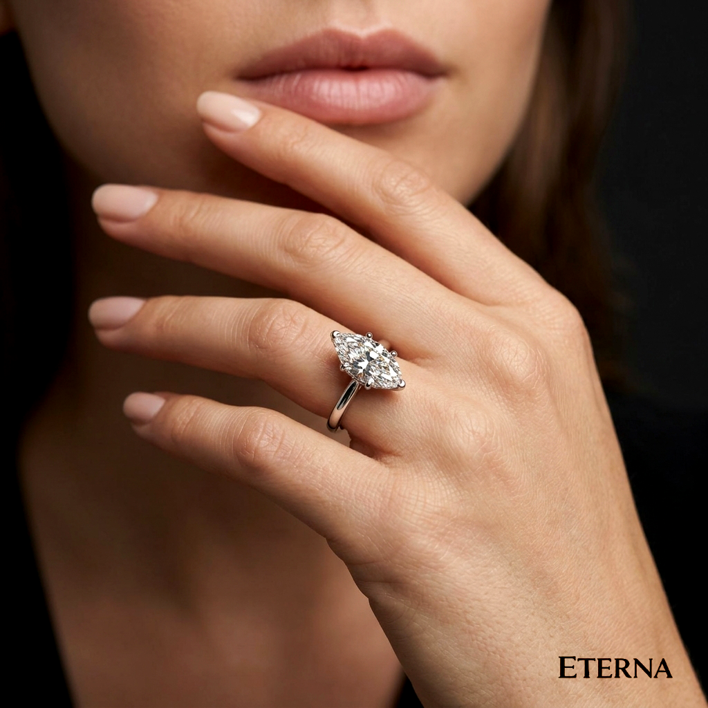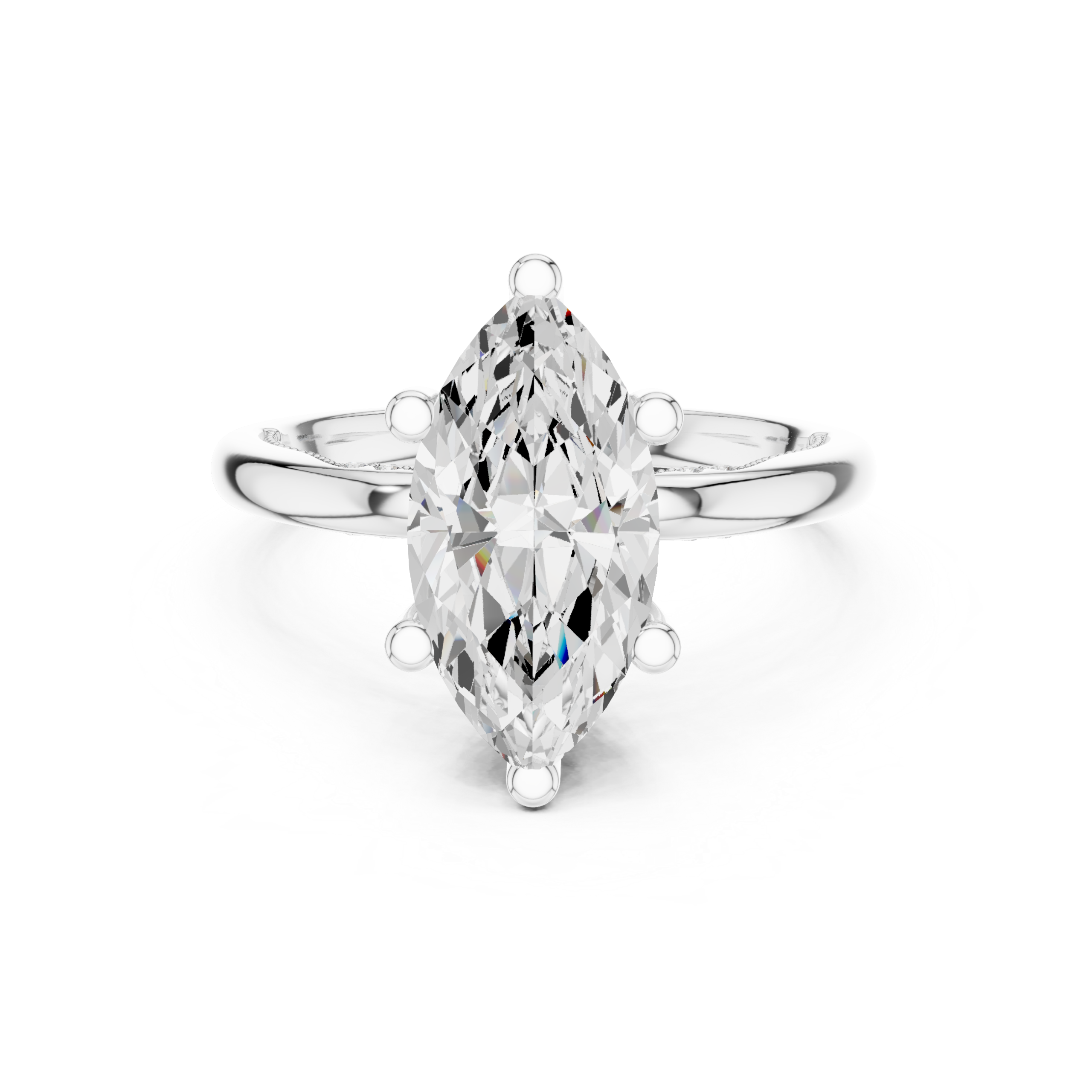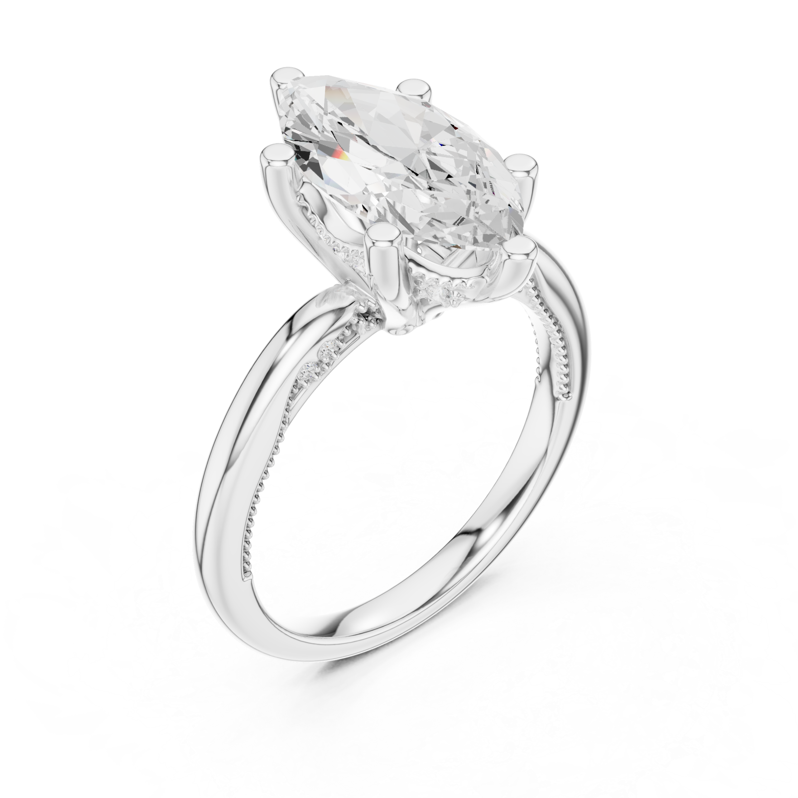 A striking expression of elegance, the Velmira Marquise Ring features a refined marquise-cut center stone secured in a classic prong setting. Designed to enhance brilliance and create a graceful elongated silhouette, this ring embodies modern sophistication and timeless luxury.