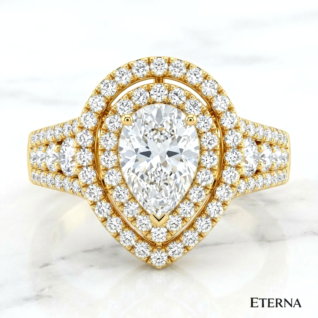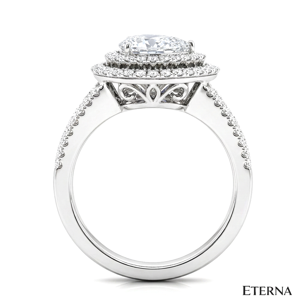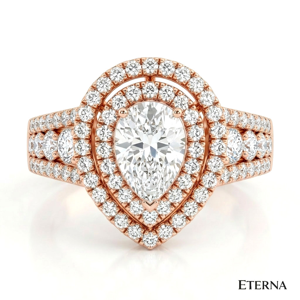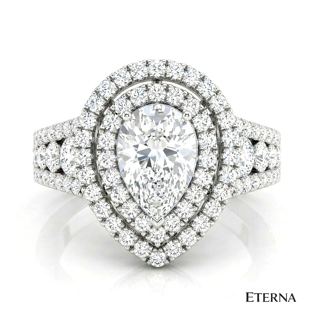 An exquisite display of brilliance and dimension, the Velmora Grand Halo Ring features a captivating pear-shaped center stone encircled by a striking double halo. Elevated on a refined split pavé band with intricate detailing, this design enhances depth and radiance, creating a bold yet graceful statement of timeless luxury.