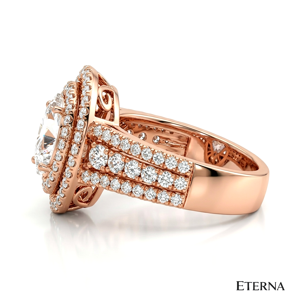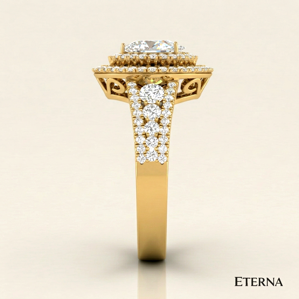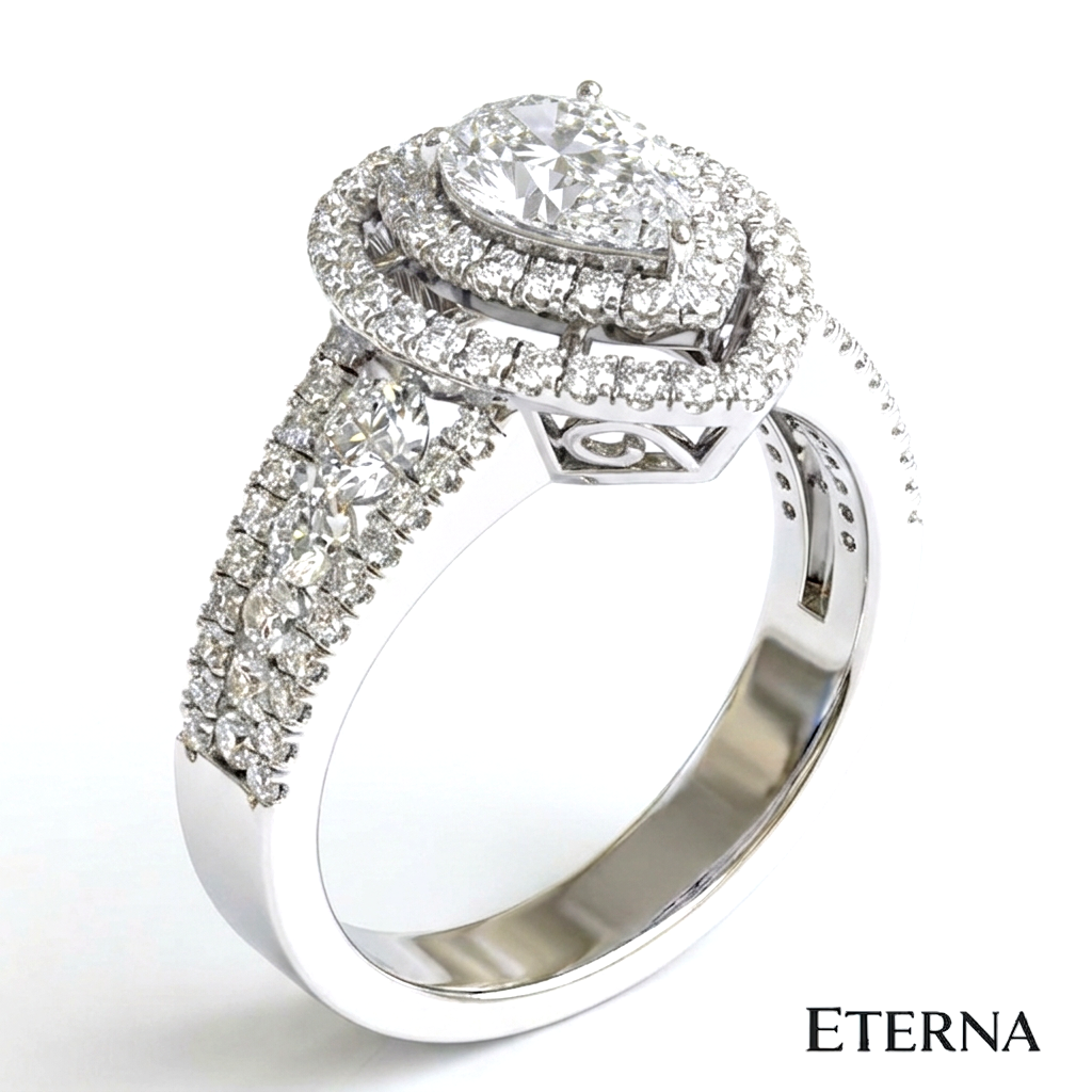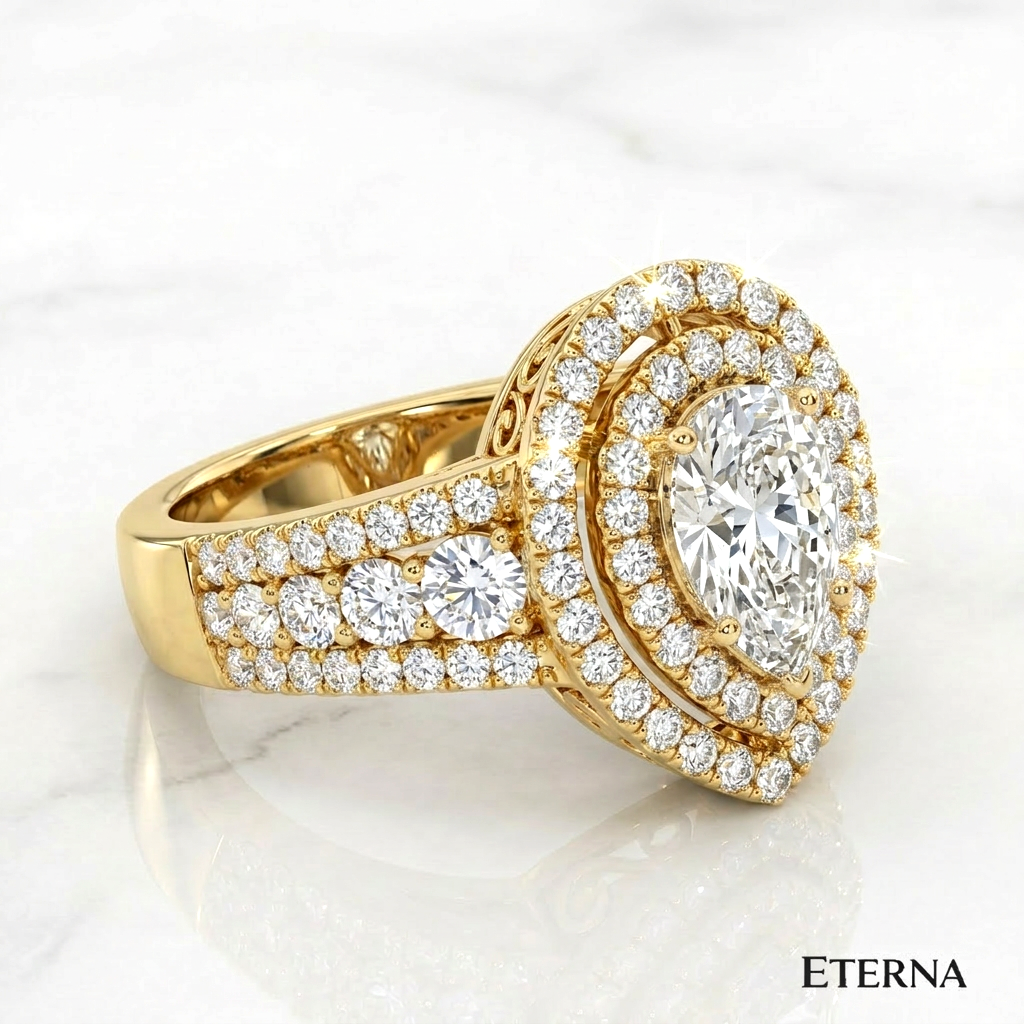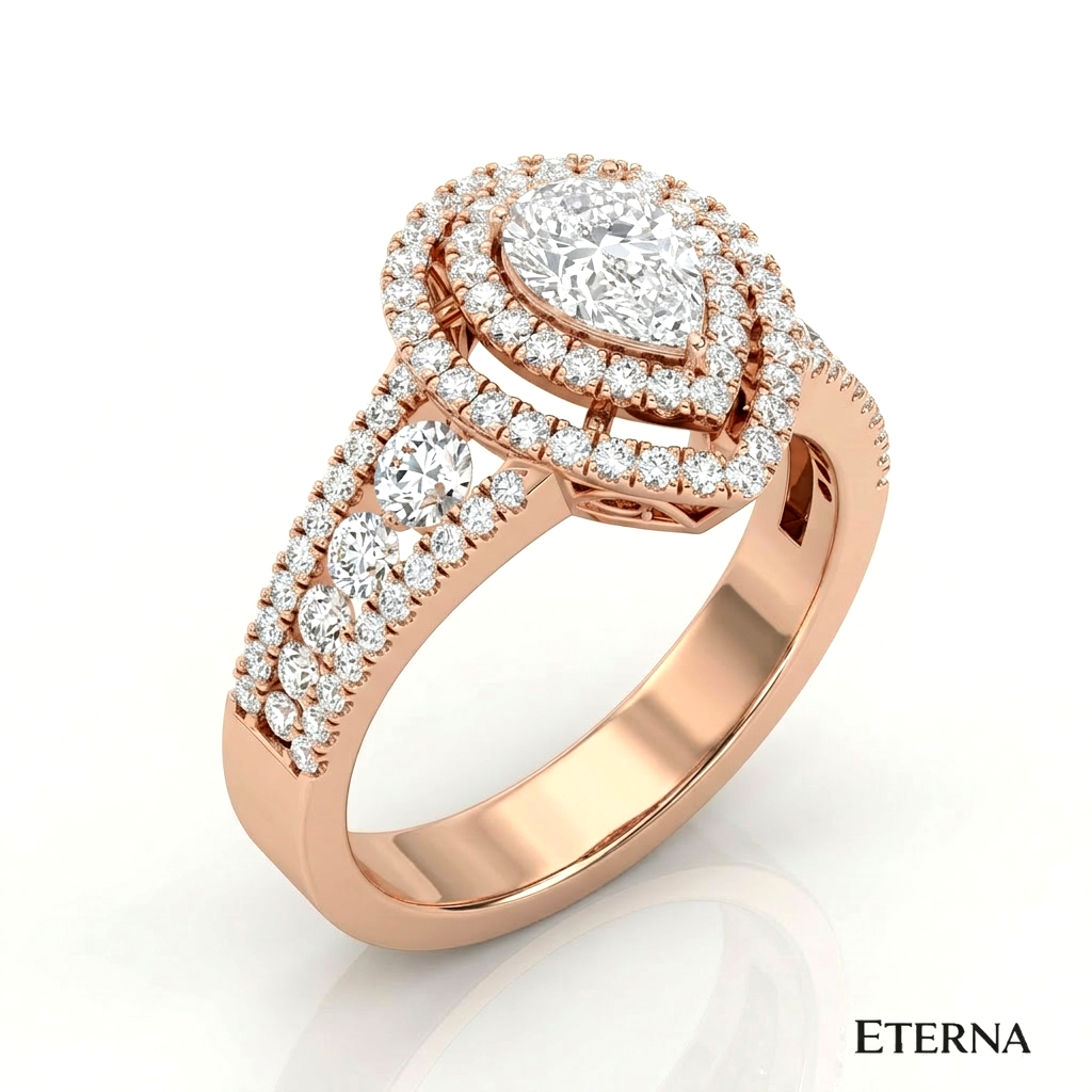 An exquisite display of brilliance and dimension, the Velmora Grand Halo Ring features a captivating pear-shaped center stone encircled by a striking double halo. Elevated on a refined split pavé band with intricate detailing, this design enhances depth and radiance, creating a bold yet graceful statement of timeless luxury.