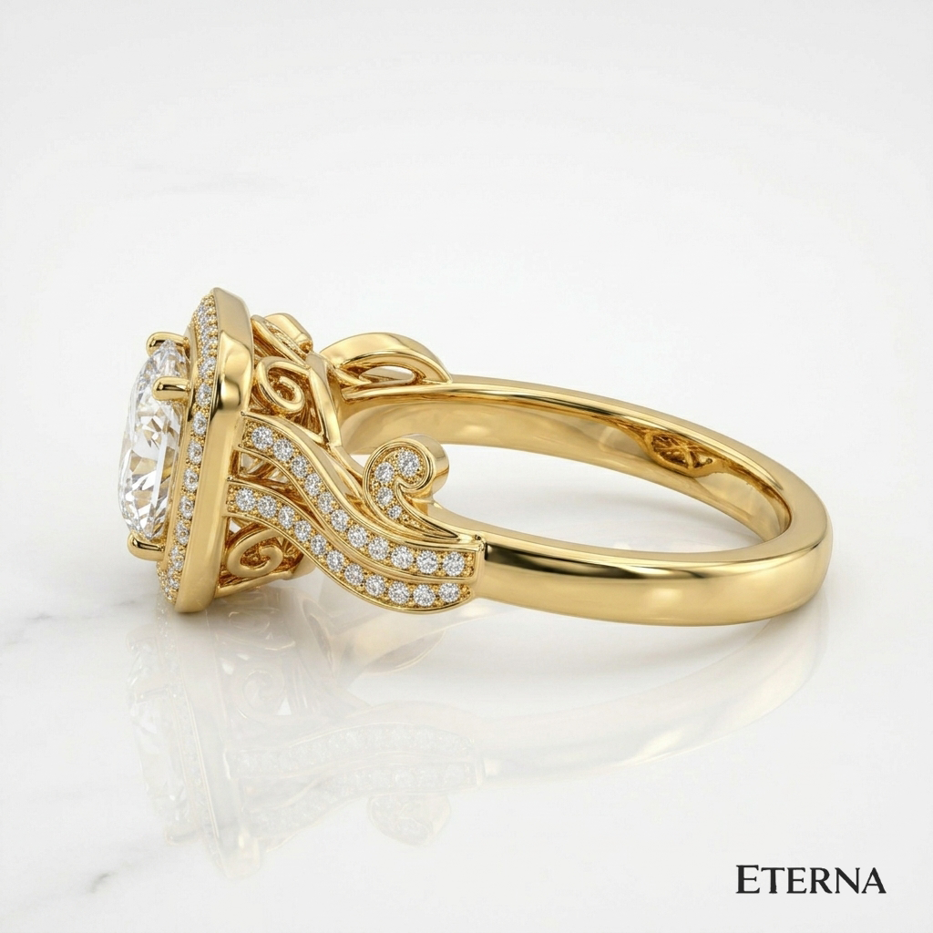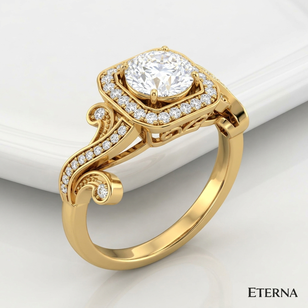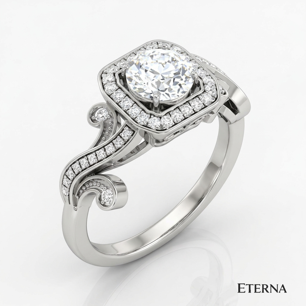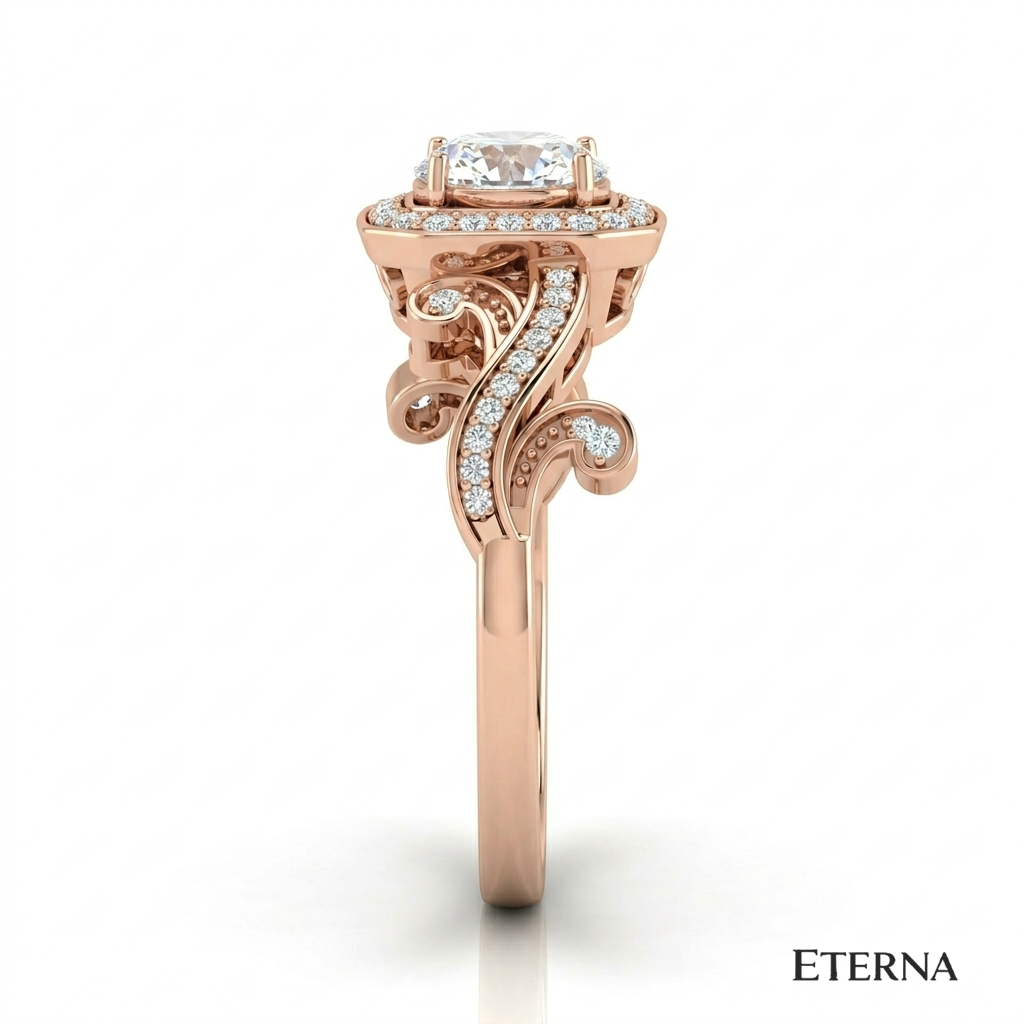 A graceful fusion of vintage artistry and brilliance, the Virelisse Round Halo Ring features a radiant round brilliant center stone framed by a refined double halo. Set on an intricately sculpted scroll band with delicate pavé detailing, this design captures light from every angle, creating a timeless expression of elegance and luxury.