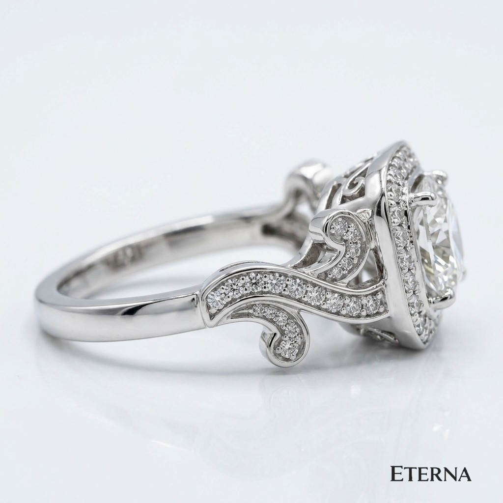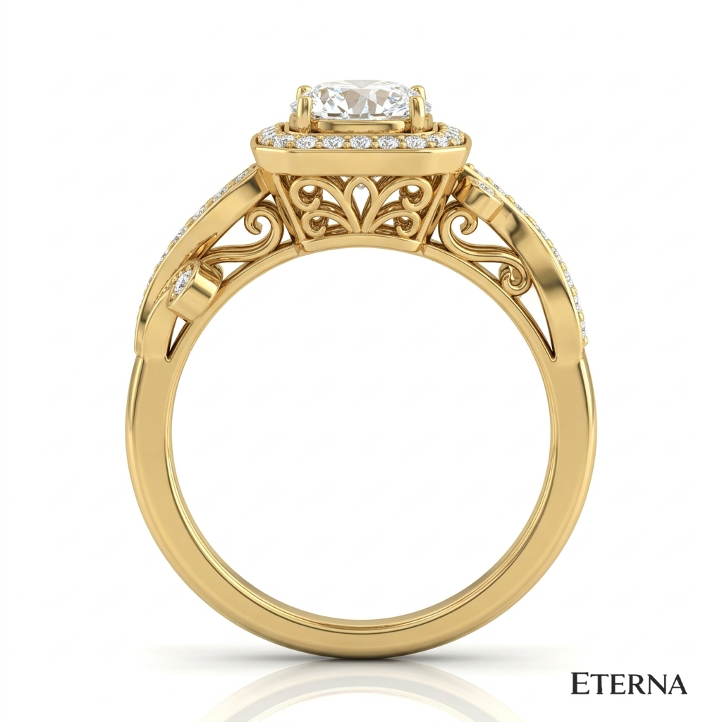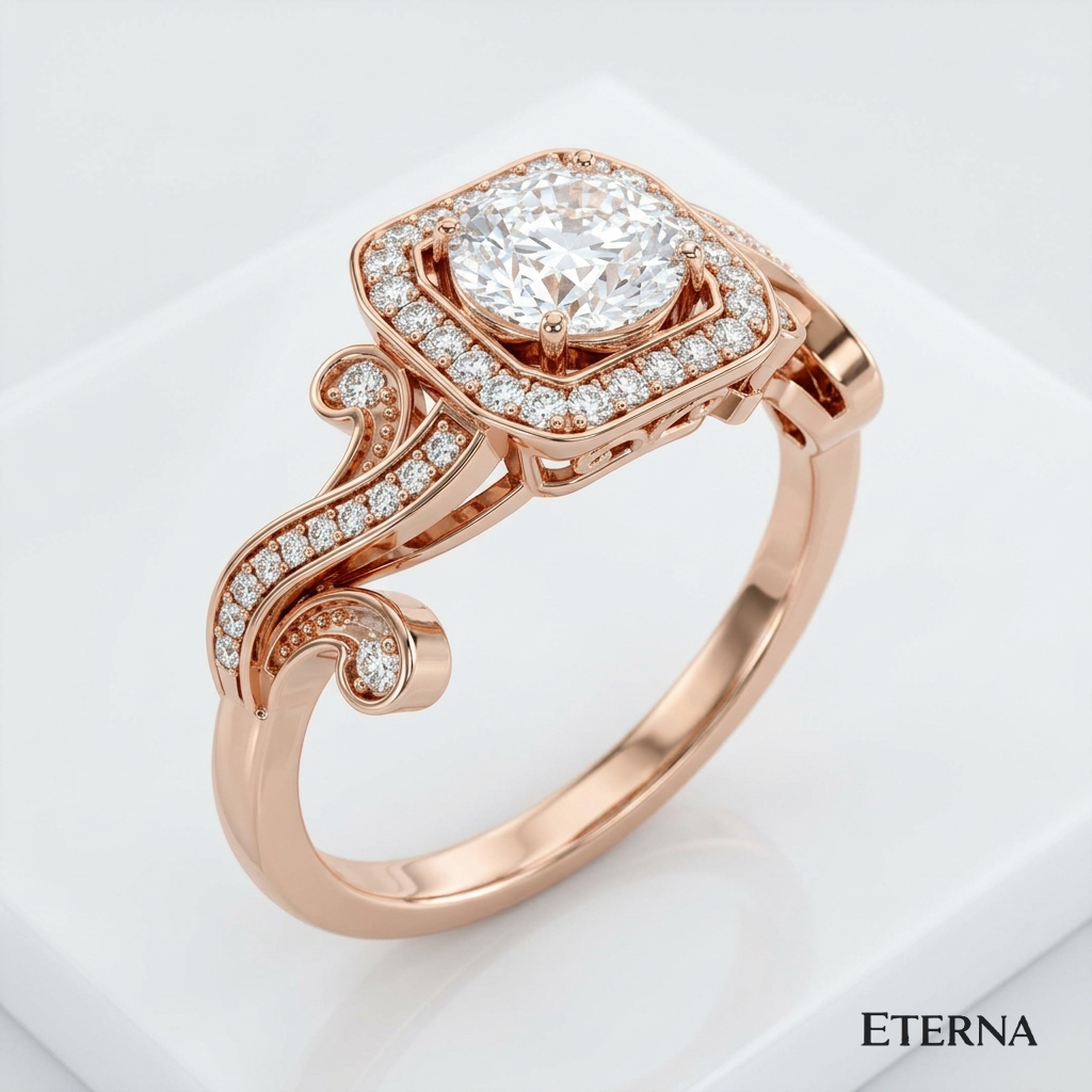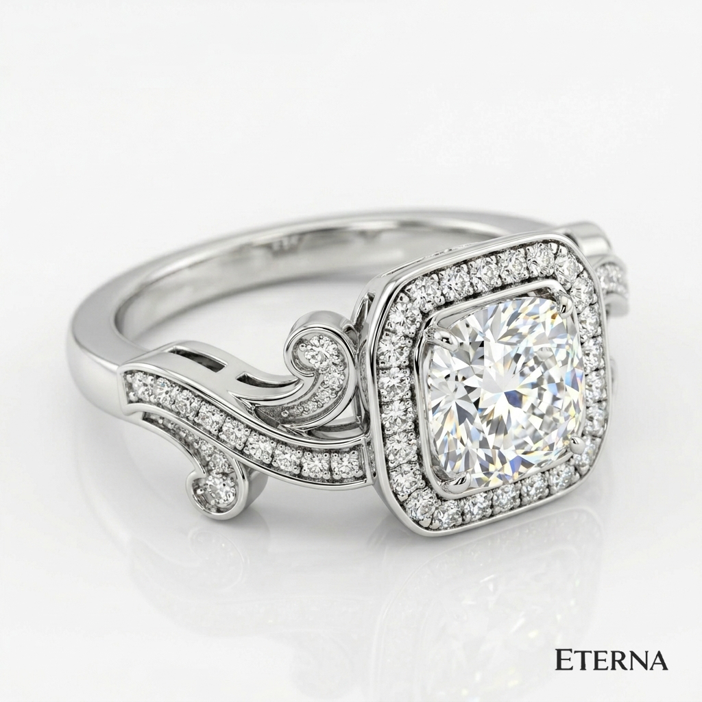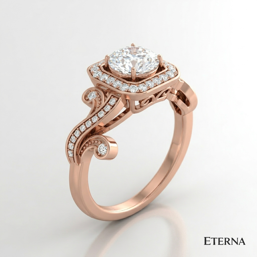 A graceful fusion of vintage artistry and brilliance, the Virelisse Round Halo Ring features a radiant round brilliant center stone framed by a refined double halo. Set on an intricately sculpted scroll band with delicate pavé detailing, this design captures light from every angle, creating a timeless expression of elegance and luxury.